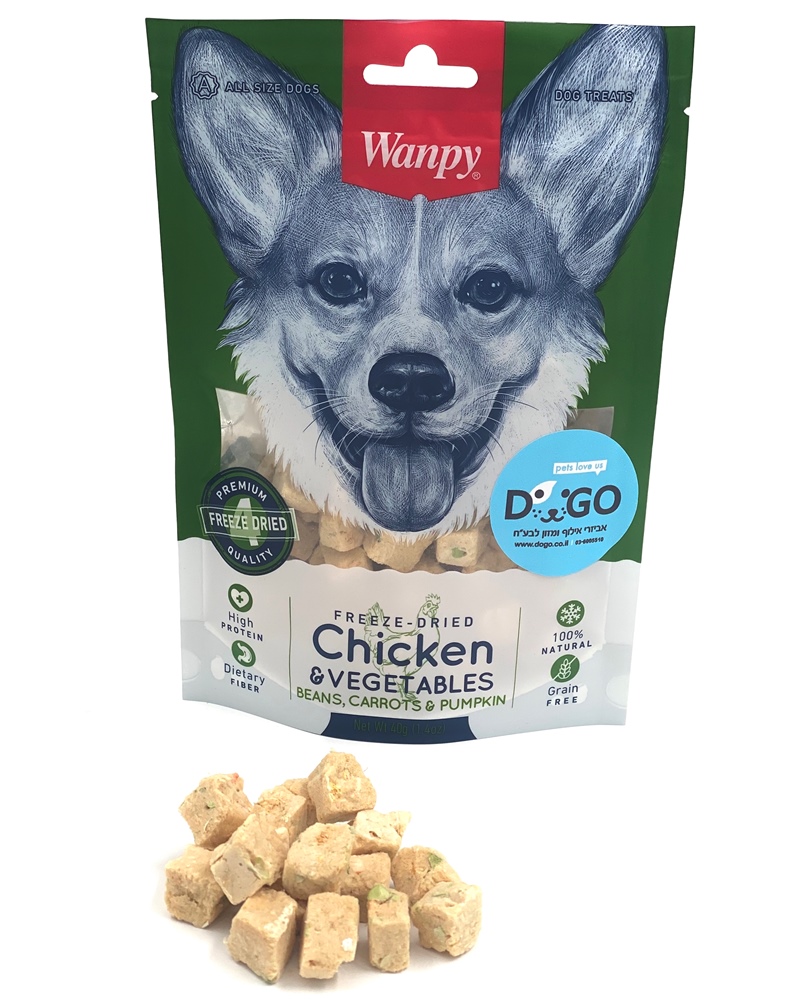עמוד הבית / תזונה טבעית 🍃 / מזון טבעי לכלבים וחתולים / מותגי תזונה טבעית / WANPY / וונפי חטיף מיובש בהקפאה עוף וירקות 40 גרם