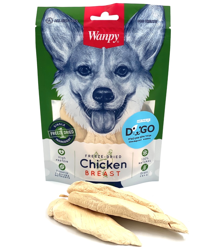 חטיף פילה חזה עוף 100% טבעי של חברת WANPY, מיוצר בשיטת FREEZE DRIED – ייבוש בהקפאה.