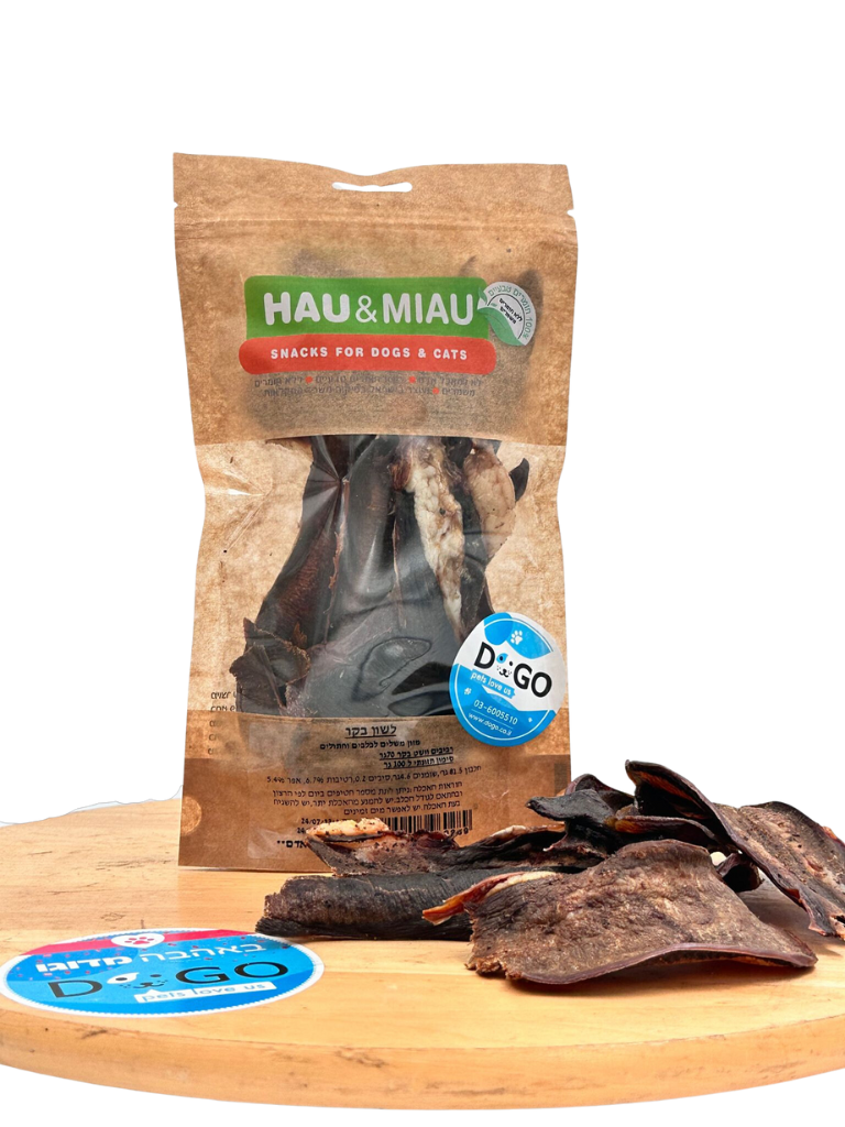 עמוד הבית / תזונה טבעית 🍃 / מזון טבעי לכלבים וחתולים / מותגי תזונה טבעית / האו ומיאו - Hau&Miau / האו ומיאו חטיף טבעי – לשון בקר 70 גרם