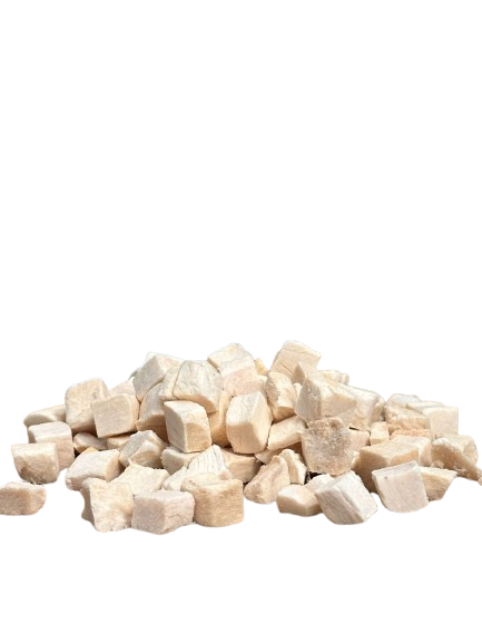קוביות חזה העוף מיובשות בתהליך ייבוש בהקפאה, השומר על הערכים התזונתיים, הטעם והמרקם – מבלי לגרוע מהנפח. כך ניתן לתת יותר חטיפים במשקל מופחת, תוך שמירה על ערך תזונתי גבוה. המרקם הקליל מאפשר שבירה פשוטה לחתיכות קטנות – אידיאלי לשימוש בזמן אימון, או כתוספת (טופינג) לארוחה לכלבים בררנים.
